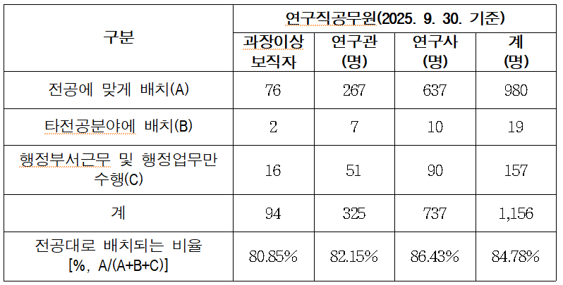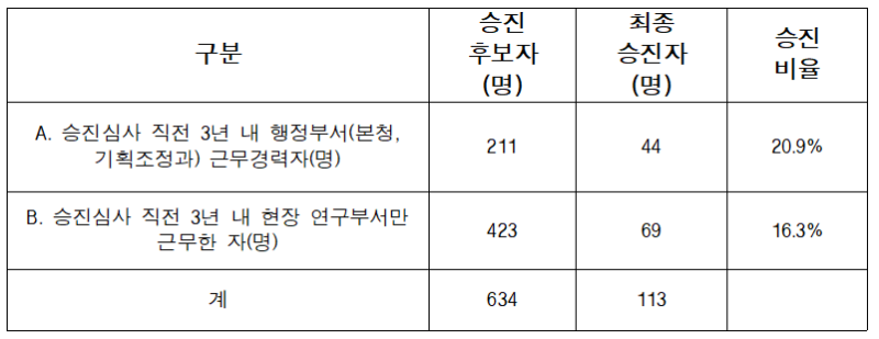 연구개발 전문기관이지만 연구직마저 승진에 유리하려면 행정직으로 빠져야 하고, 승진할수록 연구 전공과 무관하게 배치되는 비율이 높아져 기관의 연구역량 손실이 우려되는 상황인 것이다.