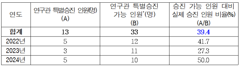 의원실이 공개한 자료에 따르면 2022년~2024년 특별승진제도를 통한 승진 인원은 13명으로, 특별승진 가능 인원인 33명의 39.4%에 불과했다.