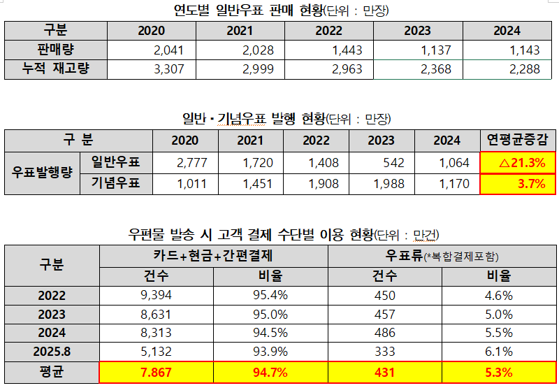 2022년부터 2025년 8월까지 최근 4년간 우편물 발송시 고객들의 결제 수단도, 카드·현금 등이 평균 약 7,800만 건(94% 이상)인 반면 우표 사용량은 430만 건(약 5%)에 불과했다.