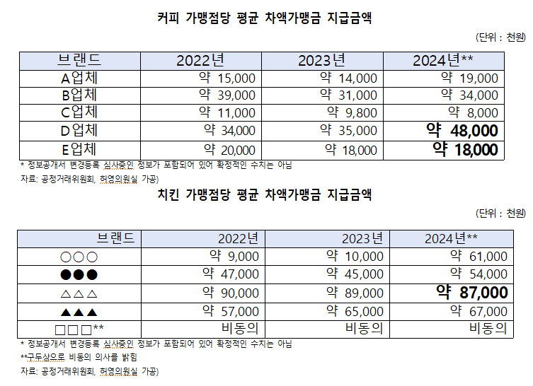 이외 치킨 프랜차이즈 또한 평균 차액가맹금이 각각 6,700만 원, 5,400만 원을 차액가맹금으로 내며 매출의 13.26%, 10.86%를 본사에 납부했다.