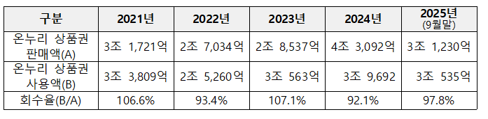 국회 산업통상자원중소벤처기업위원회 소속 구자근 국회의원(사진)이 중소벤처기업부로부터 제출받은 자료에 따르면 2021년~2025년 5년간 온누리상품권 판매액 대비 사용액을 나타내는 ‘회수율’은 98.9%에 달했다.