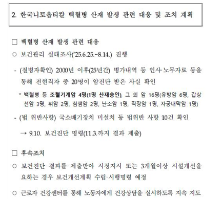 이 가운데 A씨 말고 또 다른 백혈병 피해자가 있음에도 아직 추가적인 산재신청은 이뤄지지 않은 것으로 알려졌다. 아울러 피해자에 대한 사측의 공식적인 사과나 보상대책계획도 전무한 것으로 확인됐다.