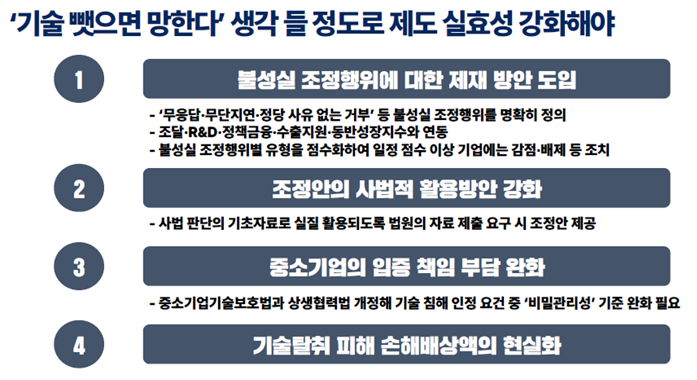 아울러 중소기업의 비밀관리성 요건을 완화할 필요성도 강조했다. 그는 “현재 기술탈취 피해를 구제받기 위해선 영업비밀로 인정받아야 하지만, 인력과 자원이 부족한 중소기업은 체계적 관리가 어려워 보호를 받지 못하는 경우가 많다”며 “중소기업기술보호법과 상생협력법을 개정해 상대적 약자의 입증 부담을 덜어야 한다”고 밝혔다.