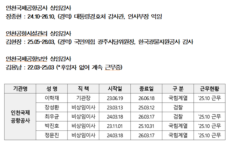 또한 “2025년 3월과 8월, 자회사 직원 2명이 잇따라 근무 중 사망하는 사고가 발생했지만 안전책임이 분리된 구조라는 명분으로 이학재 공사 사장은 방관하며 실질적 책임주체가 책임을 다하지 않았다”고 덧붙였다.
