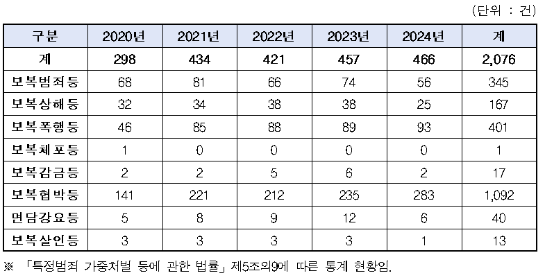 보복범죄는 △2020년 298건, △2021년 434건, △2022년 421건, △2023년 457건, △2024년 466건으로 증가 추세다. 2020년 대비 2024년까지 불과 4년새 56.4%나 급증했다.