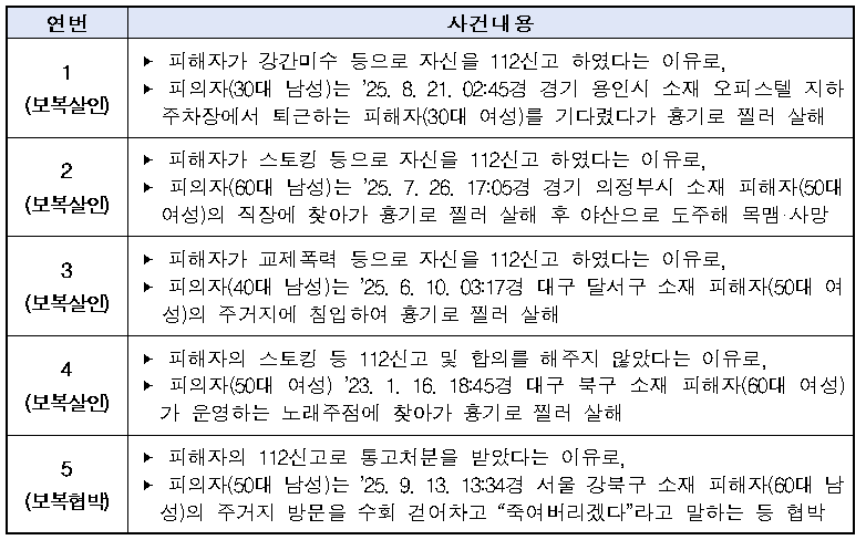 ▲올해 8월 피해자가 강간미수 등으로 자신을 112신고 하였다는 이유로, 피의자(30대 남성)는 ○○시 소재 오피스텔 지하주차장에서 퇴근하는 피해자(30대 여성)를 기다렸다가 흉기로 찔러 살해하였고, ▲7월에는 피해자가 스토킹 등으로 자신을 신고 하였다는 이유로, 피의자(60대 남성)는 ●●시 소재 피해자(50대 여성)의 직장에 찾아가 흉기로 찔러 살해 후 야산으로 도주해 목맴·사망하였고, ▲6월에도 피해자가 교제폭력 등으로 자신을 신고 하였다는 이유로, 피의자(40대 남성)는 ■■시 소재 피해자(50대 여성)의 주거지에 침입하여 흉기로 찔러 살해한 사례도 있었다.