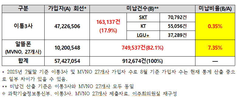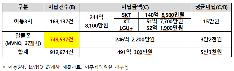 반면, MVNO(알뜰폰 27개사)의 요금 미납건수는 749,537건(246억 2,200만 원)으로 전체의 82.1%를 차지했다. 미납건수는 이통3사보다 4.6배 많았고, 미납금액 역시 이통3사보다 많은 것으로 확인되었다.