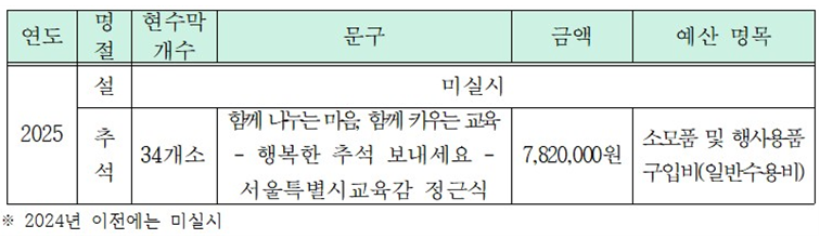 서울시교육청이 제출한 ‘최근 5년간 교육감 명절 현수막 게첩 현황’에 따르면 올해 추석 교육청은 ‘함께 나누는 마음, 함께 키우는 교육, 행복한 추석 보내세요. 서울특별시교육감 정근식’이라는 현수막을 서울시 내 34개소에 게첩한 것으로 나타났다. 예산은 약 8백만 원 상당 소요됐으며, 예산 명목은 본예산에 편성됐던 ‘소모품 및 행사용품 구입비’로 지출됐다.