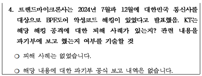 당시 KT는 BPF도어 피해 사실과 트렌드마이크로에 백신 업데이트를 요청한 사실을 함구했고, 이후 2025년 10월 2일 최민희 의원실에서 BPF도어 피해 사례를 묻는 질문에 “피해 사례가 없었다”고 허위보고했다. 확인결과, BPF도어 악성코드에 감염된 KT 서버 43대에는 가입자 개인정보보관 서버도 포함된 것으로 알려졌다.