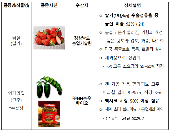 딸기의 물러짐과 기형 개선, 높은 당도로 수출 품종의 90% 이상을 차지하고 있는 경상남도농업기술원의 ‘금실’ 품종과 ㈜NH 농우바이오의 할라피뇨 고추 품종인 ‘임페리얼’이 국무총리상을 수상하였다. ‘임페리얼’은 캔 가공 전용 할라피뇨 고추로서 종주국인 멕시코 시장의 50% 이상을 점유하고, 피클 가공품으로 세계적 각광을 받고 있다.