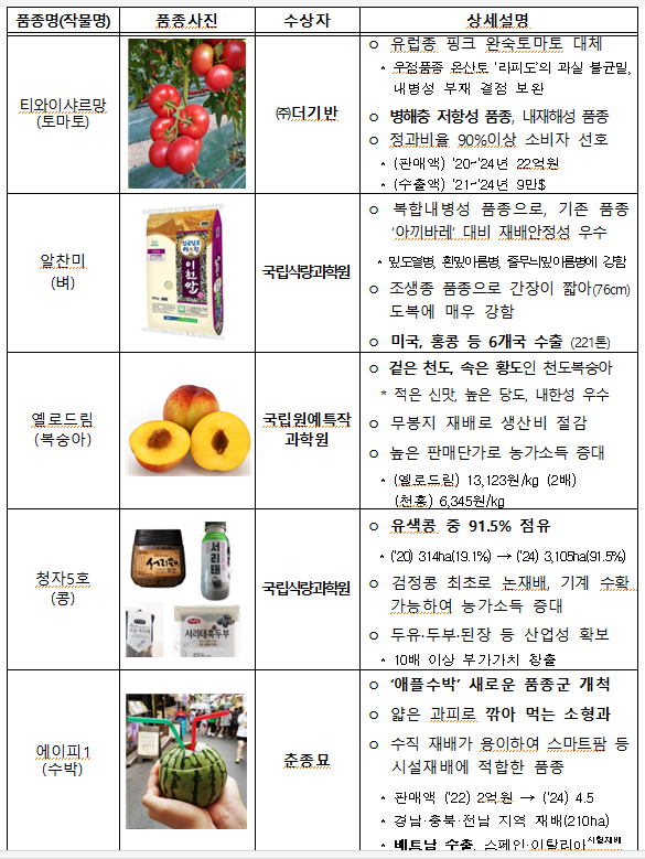 아울러, ㈜더기반의 ‘티와이 샤르망(토마토)’, 농촌진흥청의 ‘알찬미(벼)’, ‘옐로 드림(복숭아)’, ‘청자 5호(콩)’, 춘종묘의 ‘에이피 1(수박)’ 품종이 농식품부장관상의 영예를 얻었다.