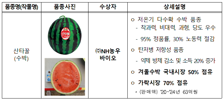 ㈜NH 농우바이오는 겨울철 잦은 강우 및 일조량 부족 등 기후변화에 대응한 ‘산타꿀’ 품종을 개발하여 대통령상 수상의 영예를 안았다. 이 품종은 겨울철 국내 수박 시장 50% 이상의 높은 점유율을 보이고 있다.