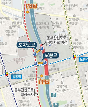 창동‧상계 동서 간 연결하는 보차도교는 폭 32m, 연장 132m, 보행교는 폭 10m, 연장 115m 규모로 2017년 9월 기본계획 수립하고 2021년 4월에 착공했다.