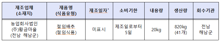 식품의약품안전처(처장 오유경)는 식품제조·가공업체인 ‘농업회사법인(주)황금마을(전남 해남군 소재)’이 제조·판매한 ‘절임배추(식품유형: 절임식품)’에 제조일자를 표시하지 않은 사실이 확인되어 해당 제품을 판매 중단하고 회수 조치한다고 밝혔다.