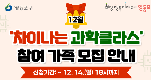 영등포구(구청장 최호권) 산하 영등포구 미래교육재단이 연말을 맞아 온 가족이 함께 참여하는 과학문화 특별프로그램 ‘차이나는 과학클라스’의 참가자를 모집한다고 밝혔다.