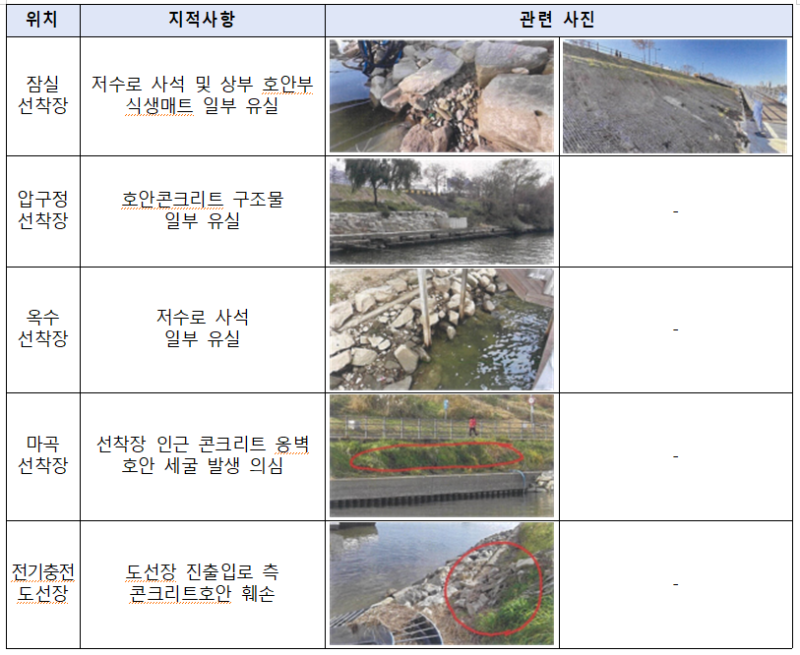 뿐만 아니라 현재 운영 중인 선착장 7개소 중 4개소, 도선장 2개소 중 1개소는 인접부 가 유실되는 등 관리가 부실한 것으로 확인됐다. 조사 당시 잠실·압구정·옥수·마곡 선착장 인근 호안부 및 저수로에서 △식생매트 △콘크리트 구조물 등의 훼손이 발견됐으나, 조사 시점 기준 서울시의 보강 조치가 전무했다는 것이 기후부의 설명이다.