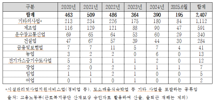 조지연 국회의원(경북 경산, 국회 기후에너지환경노동위원회)이 고용노동부로부터 받은 자료에 따르면, 2020년부터 2025년 상반기까지 흔히 과로사로 불리는 뇌심혈관질환으로 사망한 사람이 2,407명에 달한다. 뇌심혈관질환은 뇌경색, 뇌출혈, 심근경색, 심부전 등으로 대표되는 질환이다.