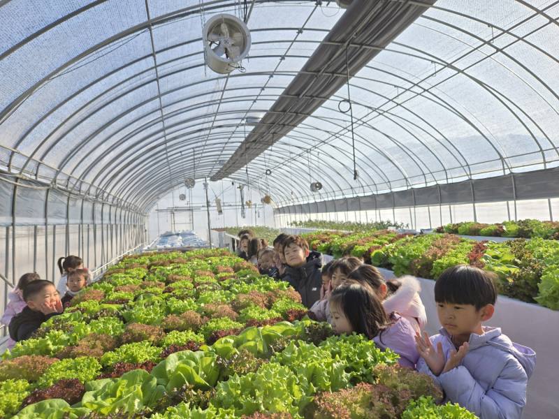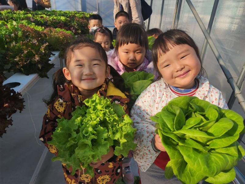 16일 경남 함안군 농촌진흥청 국립원예특작과학원 시설원예연구소 시험온실에서 인근 어린이집 어린이들이 순수 수경재배로 키운 상추를 수확하고 있다.<사진=농촌진흥청>