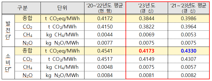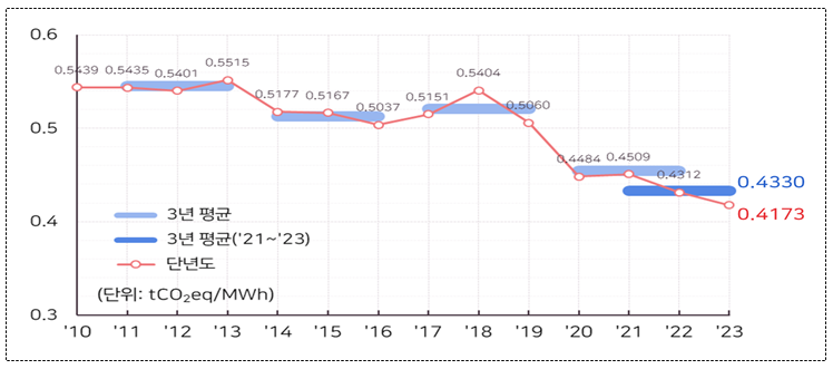 ※2023년 전력배출계수 외 이전 연도의 단년도 전력배출계수는 참고용으로 산출한 수치이며, 배출량이 정점인 2018년도를 기점으로 전력배출계수도 감소하는 추세를 보임