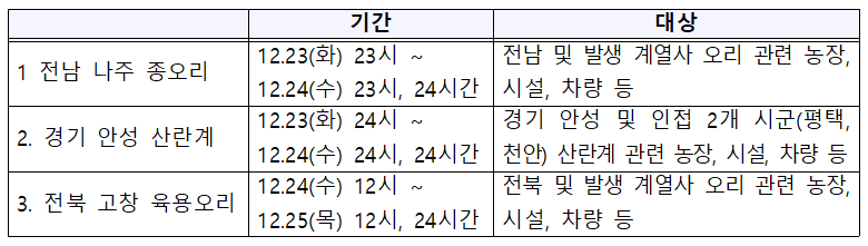 넷째, 안성, 천안 방역지역(~10km) 내 확산 방지를 위해 해당 지역을 출입하는 알·분뇨·사료 운반 차량과 관련 물품(난좌, 파레트 등)에 대해 12월 31일까지 불시에 환경검사를 실시하여 오염 여부를 확인하고, 차량 및 물품에 대한 소독을 철저히 하도록 지도·홍보한다.