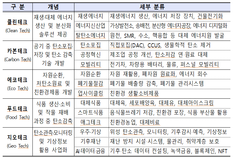 기후테크는 기후(Climate)와 기술(Technology)의 합성어다. 유엔 기후변화협약에 따르면 ‘온실가스 감축’과 ‘기후변화 대응’에 기여하는 혁신 기술을 의미하며, ‘2050 탄소중립녹색성장위원회’는 이를 △클린테크, △카본테크, △에코테크, △푸드테크, △지오테크의 5개 분야로 나누어 개념화했다.