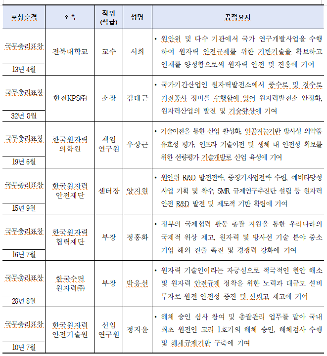 조철 한국수력원자력㈜ 실장은 월성 3·4호기 설비관리를 총괄하며 월성 4호기가 무고장 16회로 국내 최다 운전을 달성한 공로로, 김창회 한국원자력연구원 책임연구원은 자체 개발한 원전 디지털 안전계통과 안전등급 제어기기를 개발하고 신한울 1~4호기와 신고리 5·6호기에 적용하여 경제성을 드높인 공로로 각각 과학기술포장을 받았다.