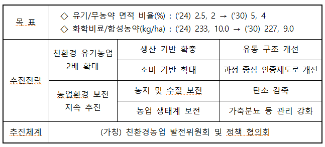 이번에 수립한 「제6차 친환경농업 육성 5개년 계획」은 친환경 유기농업 2배 확대라는 국정과제를 효과적으로 이행하고, 농지‧농업용수‧생태계 등 농업 환경도 지속적으로 개선해야 한다는 것을 목표( 친환경 인증면적 2배 확대(전체 경지면적 대비 (‘24) 유기 2.5% → (’30) 5 / 무농약2 → 4)화학비료 사용량(233kg/ha → 227) / 합성농약 사용량(10kg/ha → 9) )로 하였다.
