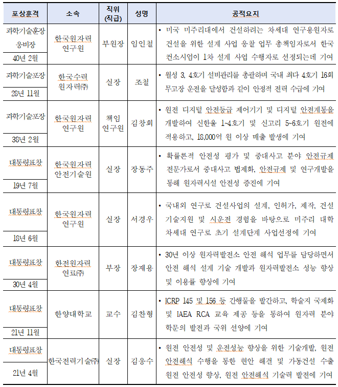 조철 한국수력원자력㈜ 실장은 월성 3·4호기 설비관리를 총괄하며 월성 4호기가 무고장 16회로 국내 최다 운전을 달성한 공로로, 김창회 한국원자력연구원 책임연구원은 자체 개발한 원전 디지털 안전계통과 안전등급 제어기기를 개발하고 신한울 1~4호기와 신고리 5·6호기에 적용하여 경제성을 드높인 공로로 각각 과학기술포장을 받았다.
