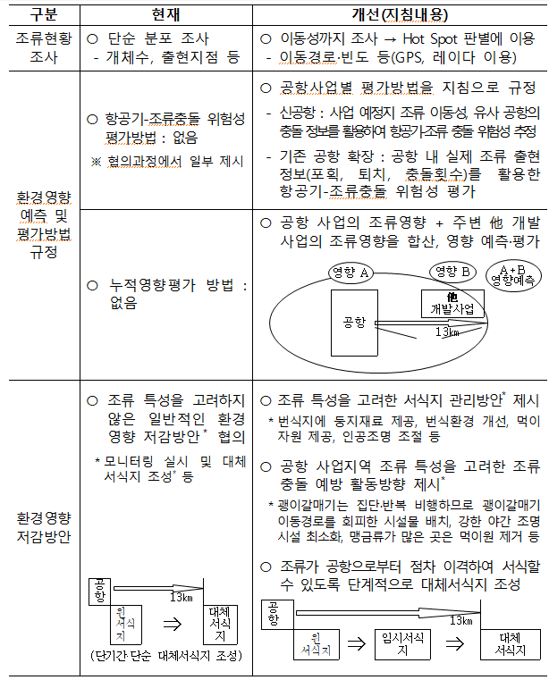 특히 이번 지침에서는 조류의 개체수뿐만 아니라 이동경로, 시기 등 이동성까지 조사토록 하고, 신규 공항 또는 기존 공항 확장 등 사업유형에 따른 조류 영향 예측방법을 제시했다. 아울러 누적환경영향평가( 공항개발 시 공항 내·외에서 조류의 분포·이동에 영향을 미칠 수 있는 타 개발사업이 있을 경우, 해당 사업이 조류에 미치는 영향과 공항사업 영향을 합산, 영향 예 )방법을 마련하여 계획 단계에서부터 잠재적 영향과 위험요인을 체계적으로 점검하도록 했다.