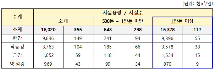 Ⅱ·Ⅲ 지역 공공하수처리시설 중 처리용량이 하루 1만톤 이상의 대규모 공공하수처리시설은 117곳으로 전체 방류량의 96%를 차지하며, 이번 총인 수질기준 강화를 통해 하류 수계로 배출되는 총인 배출량이 기존 하루 1,783㎏에서 576㎏으로 줄어 매일 약 1,207㎏이 감축될 것으로 예상된다.