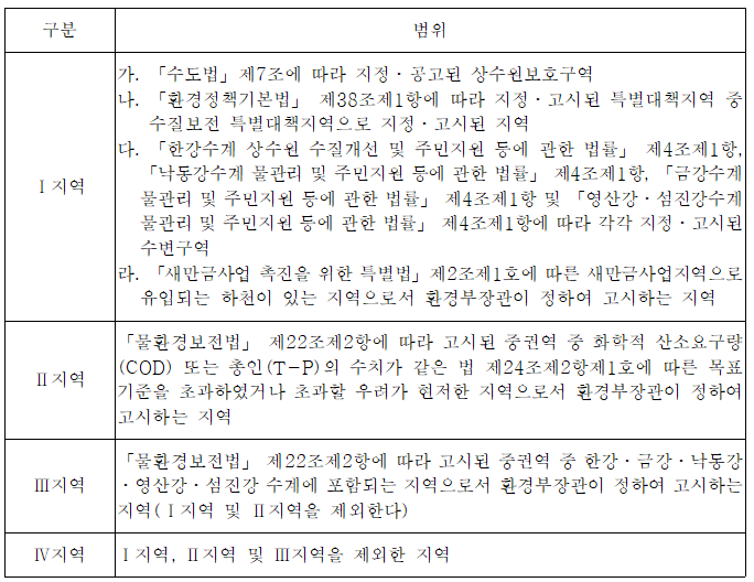 그동안 공공하수처리시설 방류수 수질기준은 전국을 수질관리 중요도에 따라 Ⅰ~Ⅳ (Ⅰ지역(상수원 보호구역 등), Ⅱ지역(5대강 수계 목표수질 초과, 초과 우려 지역), Ⅲ지역(5대강 수계로서 Ⅰ, Ⅱ지역을 제외한 지역), Ⅳ지역(5대강 外 지역))지역으로 나누고, 상수원보호구역 등 수질관리 중요성이 특히 높은 곳은 Ⅰ지역, 5대강 수계는 Ⅱ․Ⅲ지역으로 구분하여 서로 다른 수질을 적용했다.