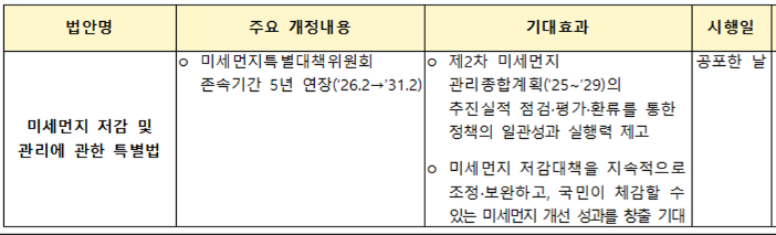 국무총리와 민간위원장을 공동위원장으로 하는 미세먼지특별대책위원회(공동위원장(국무총리‧민간위원장) 포함 40인 이내, (기능) 미세먼지 대책 관련 사항 심의 )는 현행법 상 2026년 2월까지 한시적으로 운영 예정이었으나,‘제2차 미세먼지 종합계획(‘25∼‘29)’에 대한 심의 일정 등을 고려하여, 2031년 2월까지 위원회의 존속기한을 5년 연장토록 했다.