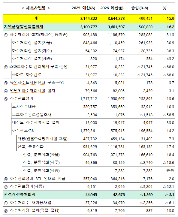한편 올해 기후에너지환경부는 하수도 분야 예산은 지난해보다 4,995억 원(15.9%↑)이 늘어난 3조 6,443억 원으로 편성됐다. 하수관로 정비 사업은 올해 1조 9,506억 원으로 지난해(1조 7,177억 원)에 비해 13.6%로 늘어났다.