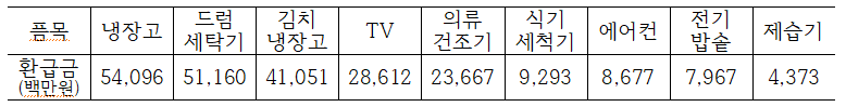 기후에너지환경부는 올해 1월 16일까지 신청을 접수한 결과, 약 196만건(2,624억 원)이 접수되어 심사를 통해 부적정 신청, 환급금 과다산정 등 약 276억 원을 걸러내고 약 185만건(2,348억 원)의 보조금을 환급했다. 주요 환급품목은 냉장고, 드럼세탁기, 김치냉장고, 텔레비전, 의류건조기 순이었다.