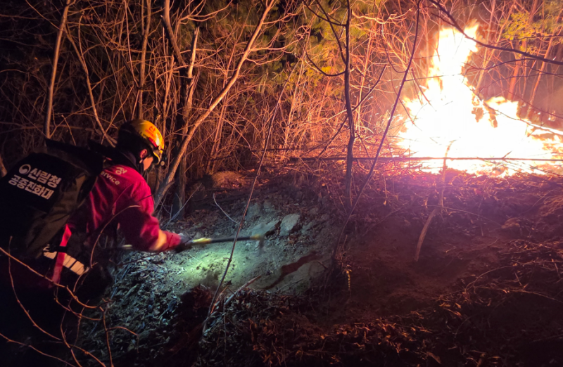 야간 산불 진화를 위한 진화차량 108대, 진화인력 721명을 투입하여 산불 지상진화에 집중하고 있으며, 현장에는 서남서의 바람이 평균풍속 2.4㎧로 불고 있다.