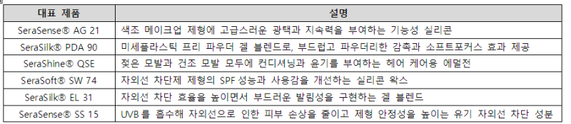 실제로 ▲색조 메이크업 제형에서 고급스러운 광택과 지속력을 구현하는 ‘SeraSense® AG 21’ ▲미세플라스틱 프리(Microplastic-free) 설계를 적용한 ‘SeraSilk® PDA 90’ ▲젖은 모발과 건조 모발 모두에 컨디셔닝과 윤기를 부여하는 헤어 케어용 에멀전 ‘SeraShine® QSE’ 등 다양한 제형에 적용 가능한 제품들을 선보이고, 부스에서는 제형 데모를 통한 체험과 기술 상담을 진행하는 등 해외 파트너 및 바이어를 대상으로 한 맞춤형 기술 미팅을 통해 협업 기회를 모색한다.