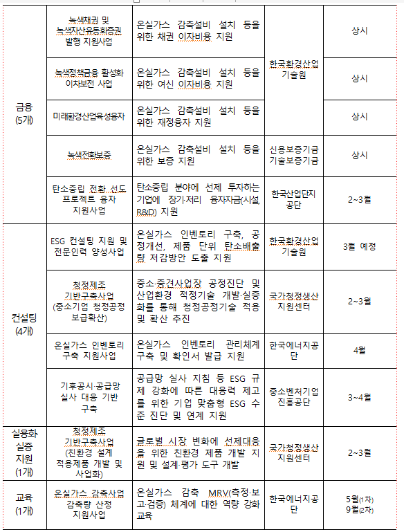 참여 유관기관은 한국환경공단, 한국환경산업기술원, 신용보증기금, 기술보증기금, 한국에너지공단, 한국산업단지공단, 국가청정생산지원센터, 중소벤처기업진흥공단, 한국섬유수출입협회이다.