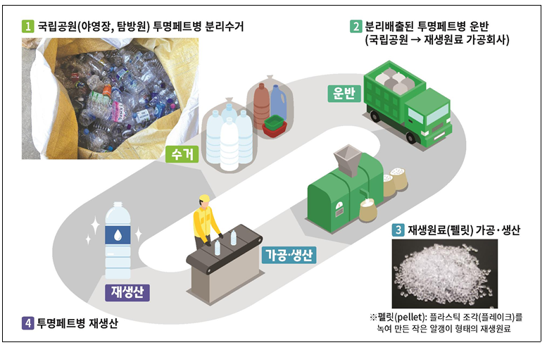 국립공원공단은 지리산, 설악산, 북한산 등 전국 12개 사무소 야영장 등 주요 거점에 투명페트병 별도 수거 체계를 운영하고, 탐방객을 대상으로 자원순환 인식개선 활동을 펼친다.