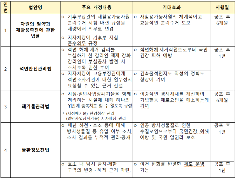 기후에너지환경부는 이날 국회를 통과한 4개 법률안이 정책 현장에서 차질없이 시행될 수 있도록 하위법령 정비 등 제반 여건 준비에 최선을 다할 예정이다.