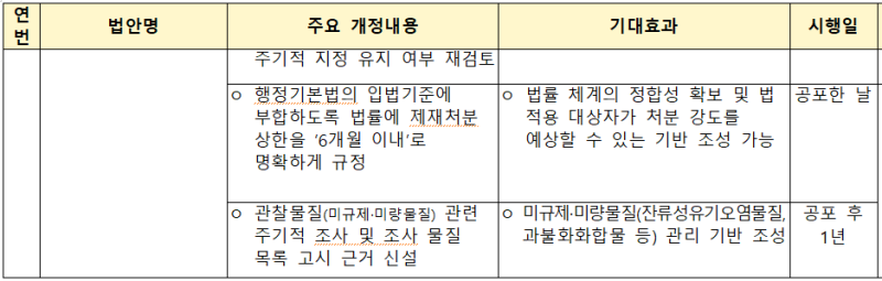 하천, 호소에서 수질과 수생태계에 영향을 줄 우려가 있는 새로운 물질을 관찰물질로 지정하여 주기적으로 조사토록 하는 한편,낚시금지·제한구역 지정 이후, 정기적으로 지정 여부를 재검토하고 필요할 경우 금지·제한구역을 변경‧해제 할 수 있도록 하는 근거를 마련했다.