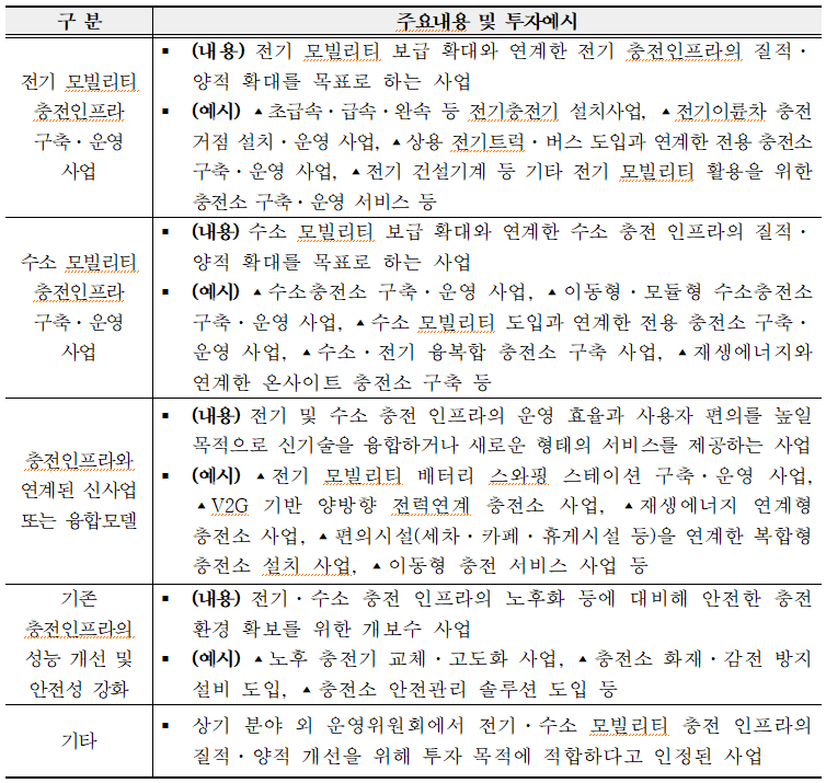 투자 대상은 △전기‧수소충전 기반시설 구축‧운영 사업(전기충전기 설치, 수소충전소 구축, 재생에너지와 연계한 수소 생산 및 충전소 구축 등), △충전 기반시설과 연계된 신사업 또는 융합모델(전기 모빌리티 배터리 교체 거점 구축, 양방향 충‧방전(V2G:전기차 배터리 에너지를 충전기를 통해 전력망에 공급·판매 ) 기반 전력 연계 충전소 구축 등), △노후 충전시설의 성능개선과 안전성 강화를 위한 사업 등이다.