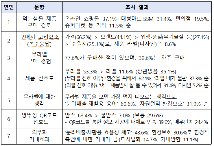 올해 1월부터 무라벨 제도가 본격 시행됨에 따라 온라인 및 오프라인 소포장(묶음) 먹는샘물 제품은 무라벨 방식으로만 생산·유통된다. 오프라인 낱병 판매 제품은 정보무늬(QR) 코드 스캔 등 판매 단계에서 보완이 필요하다는 현장의 의견을 수렴하여, 1년간 ‘전환 안내 기간’이 운영되어 혼란을 최소화하며 단계적인 전환을 추진 중이다.