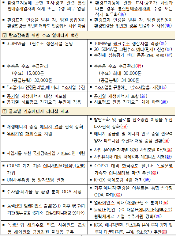 기업 경영 측면에서는 국제사회의 다양한 탄소규제 대응을 위해 위해 제품전과정목록(LCI) 데이터베이스를 구축하고 국내외 기후공시로 인한 이중 부담을 완화하도록 관련 제도와 시스템을 정비한다.