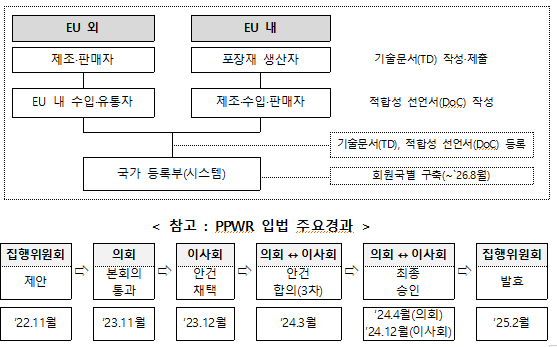 최근 유럽연합(EU)은 에코디자인 규정(ESPR: 지속가능제품을 위한 에코디자인 규정 ), 포장·포장폐기물 규정(PPWR:포장 및 포장폐기물 규정 )을 통해 제품·포장재의 환경성 요구사항을 구체적으로 정하고, 라벨 또는 전자매체를 통한 환경영향정보의 표시의무를 2027년 이후 부여할 예정이다.