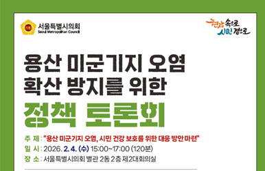 서울시의회 도시안전건설위원회 부위원장으로 활동하고 있는 김용호 시의원(국민의힘, 용산1)은 오는 2월 4일 오후3시 서울시의회 별관 제2대회의실에서「용산 미군기지 오염 확산 방지, 시민 건강과 보호를 위한 대응 방안 마련 토론회」를 개최해 용산 미군기지 주변 지역과 주택지의 토양·지하수 오염 실태와 정밀조사의 필요성, 현행 관리·정화 체계의 한계를 전문가 논의를 통해 종합적으로 살펴볼 예정이다.