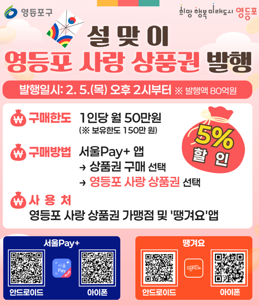 영등포 사랑상품권은 ‘서울페이 플러스(서울PAY+)’ 앱을 통해 5% 할인된 금액으로 구매할 수 있다. 스마트폰에 앱을 설치한 뒤 본인 인증과 계좌 등록을 완료하면 누구나 간편하게 이용 가능하다.