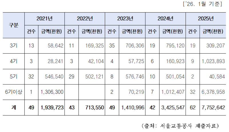 2021년 49건·19억 원 수준이던 체납은 2022년 43건·7억 원으로 잠시 감소했으나, 2023년 49건·14억 원, 2024년 42건·34억 원으로 다시 확대되며 특히 2024년에 고액 체납으로 급증하는 구조적 변화가 나타났다. 이는 체납이 단순한 일시적 현상이 아니라 상습·고액화되는 경향을 보이며 누적되고 있음을 의미한다.