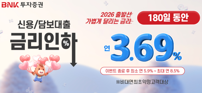 이번 이벤트는 지난 1월 26일부터 4월 24일까지 약 3개월간 진행되며, 비대면 계좌를 개설한 개인 및 법인 고객을 대상으로 한다. 이벤트 기간 중 최초로 신용융자 또는 담보대출을 약정한 고객에게는 약정일로부터 180일간 연 3.69%의 우대금리가 적용된다.