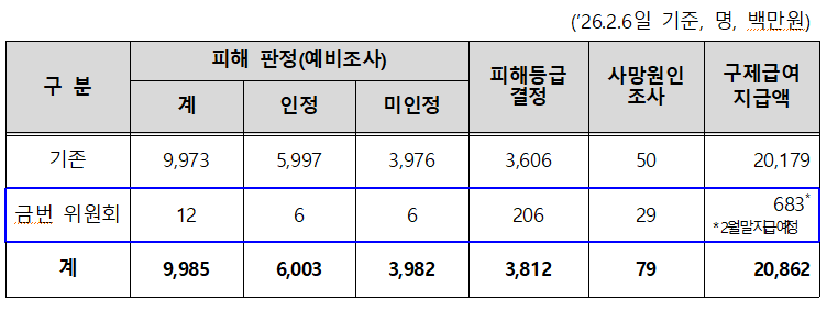아울러 △2024년도 및 2025년도에 이미 피해를 인정받았으나 피해등급을 결정받지 못했던 206명에 대해 피해등급을 결정했다. 또한 △ 장항제련소로 인한 피해인정질환이 주된 원인이 되어 사망한 5명의 유족에게 장의비 및 유족보상비의 지급도 결정했다.
