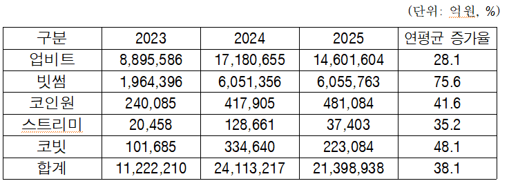 최근 3년간 빗썸의 거래대금과 거래 참가자수는 각각 3배 증가했다. 거래금액은 2023년 196조 4,396억원에서 2025년 605조 4,763억원으로 확대됐으며, 같은 기간 거래 참가자수는 130만 4,229명에서 388만 5,471명으로 늘어났다.